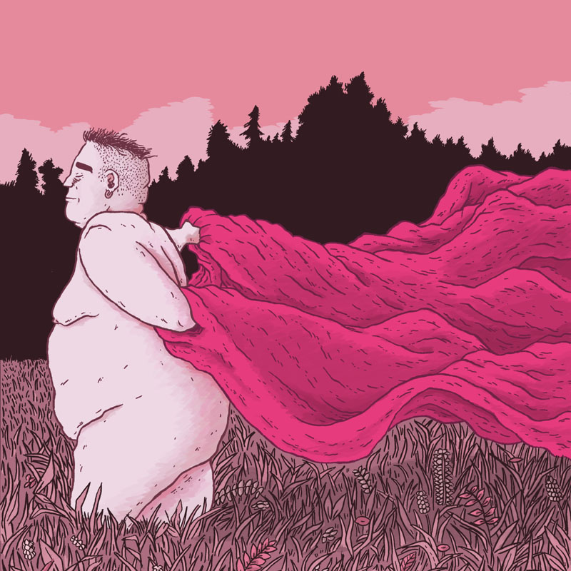 Kolbeinn Karlsson har i flera verk undersökt normer kring manliga kroppar och manliga relationer. I utställningen utvecklar han samma tematik. I en självlysande låda finns en teckning av en man som med bestämda steg vadar genom en äng på väg ut ur bild samtidigt som hans klädesplagg blåser av bakom honom.
