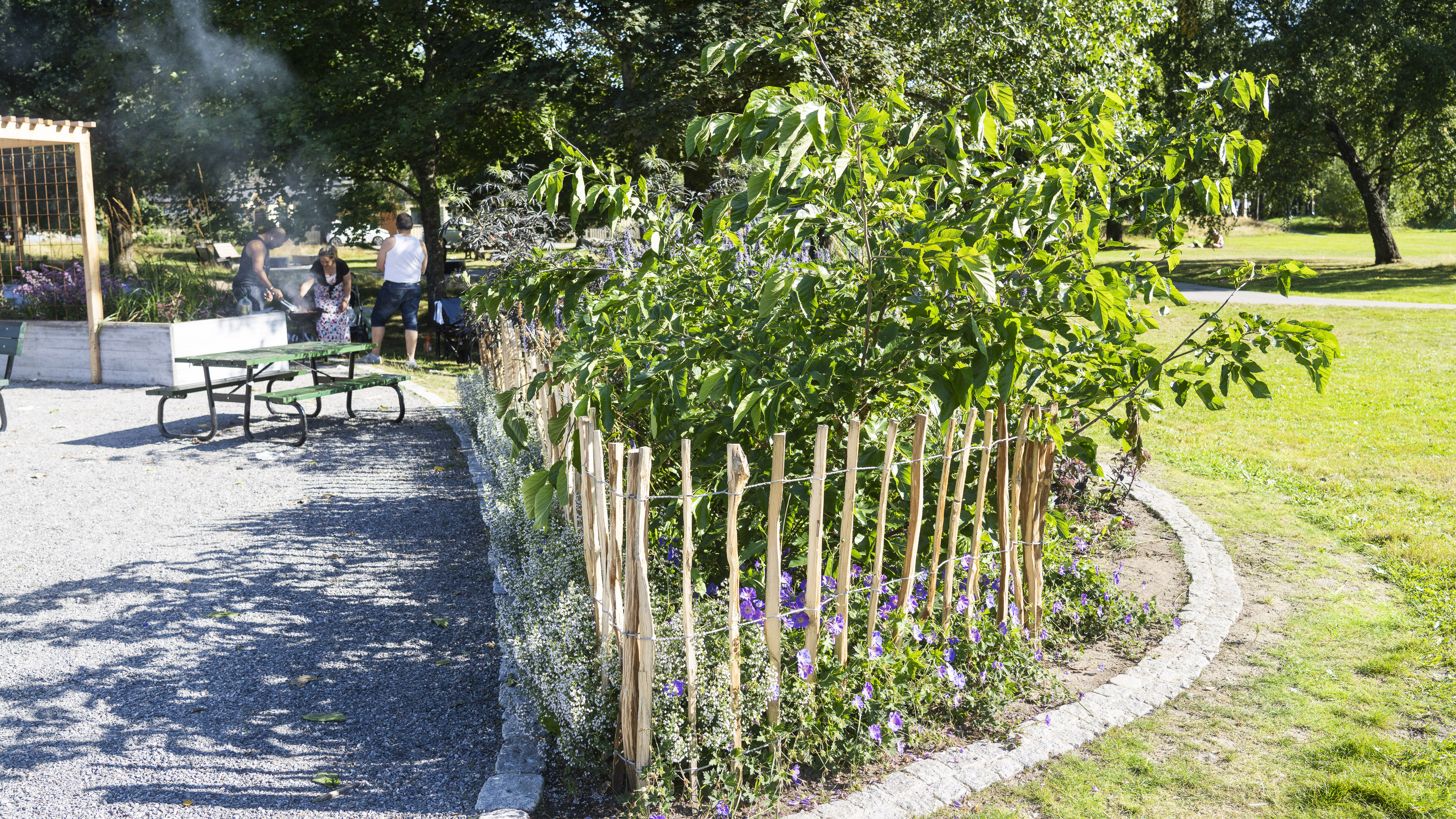 Här växer bland annat anisisop, lavendel, kärleksört och minikiwi – växter som kan användas i matlagning. Du hittar också prydnadsgräset tuvrör.